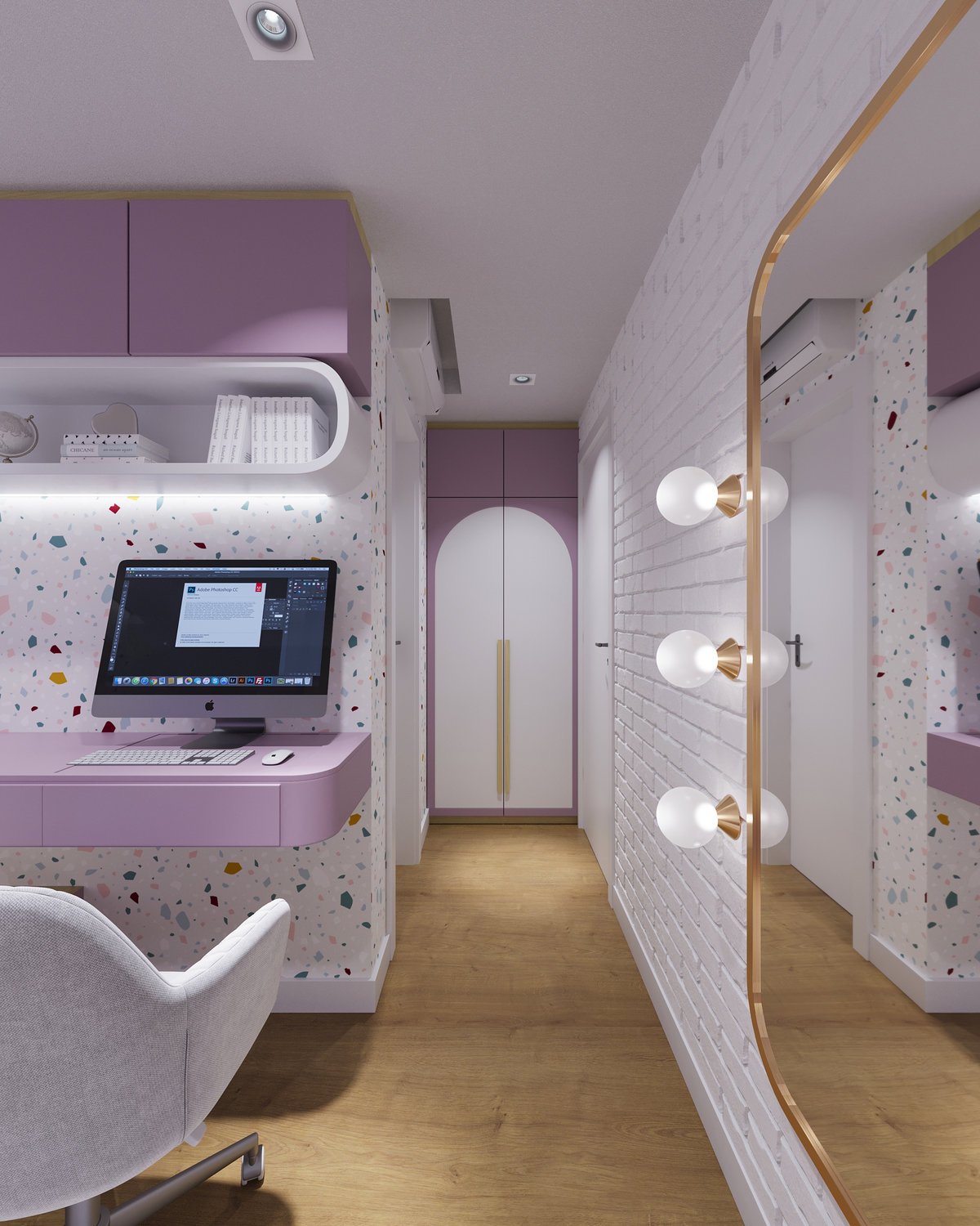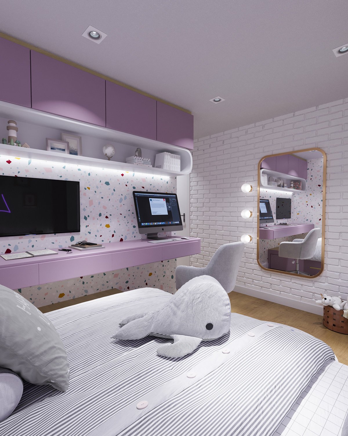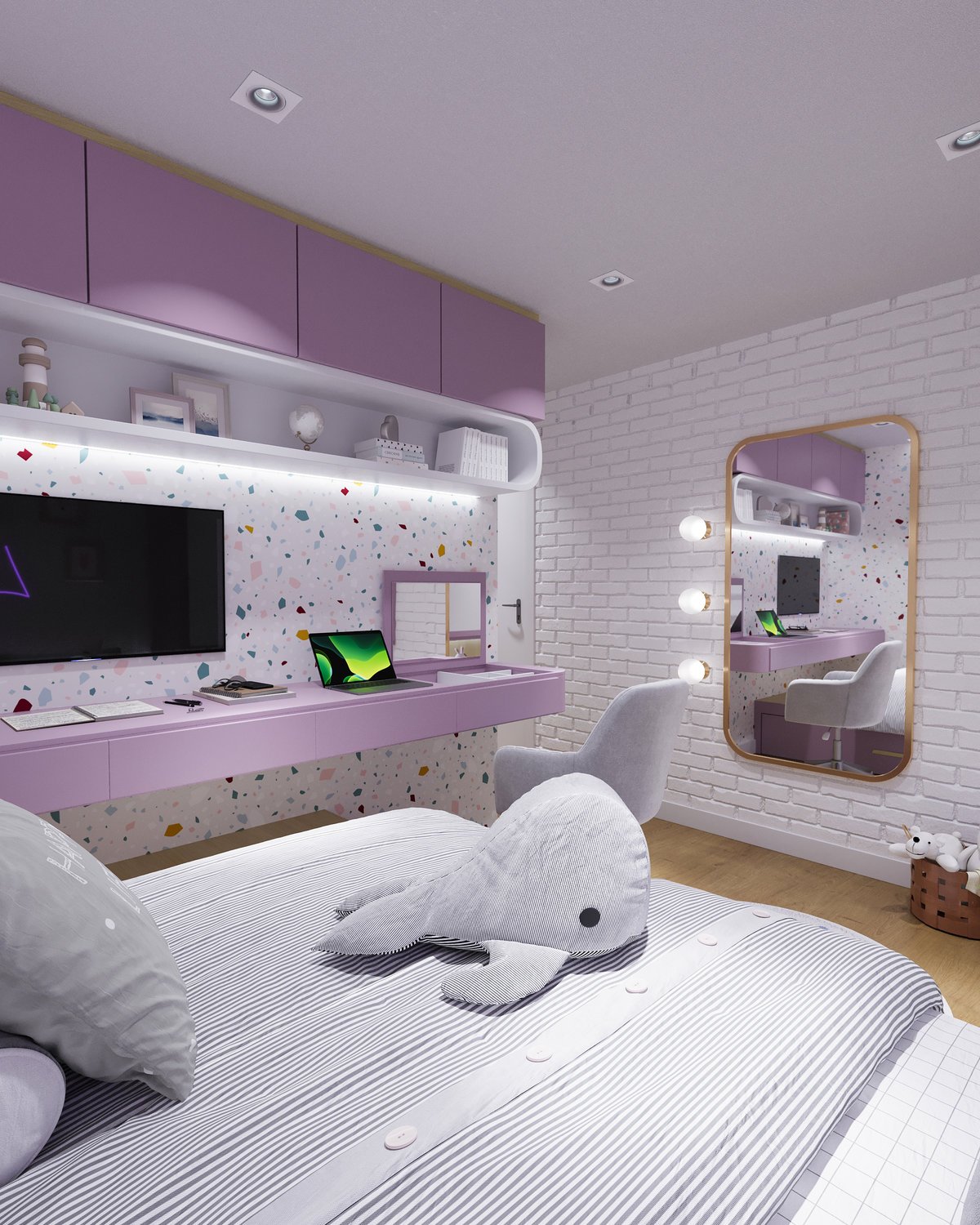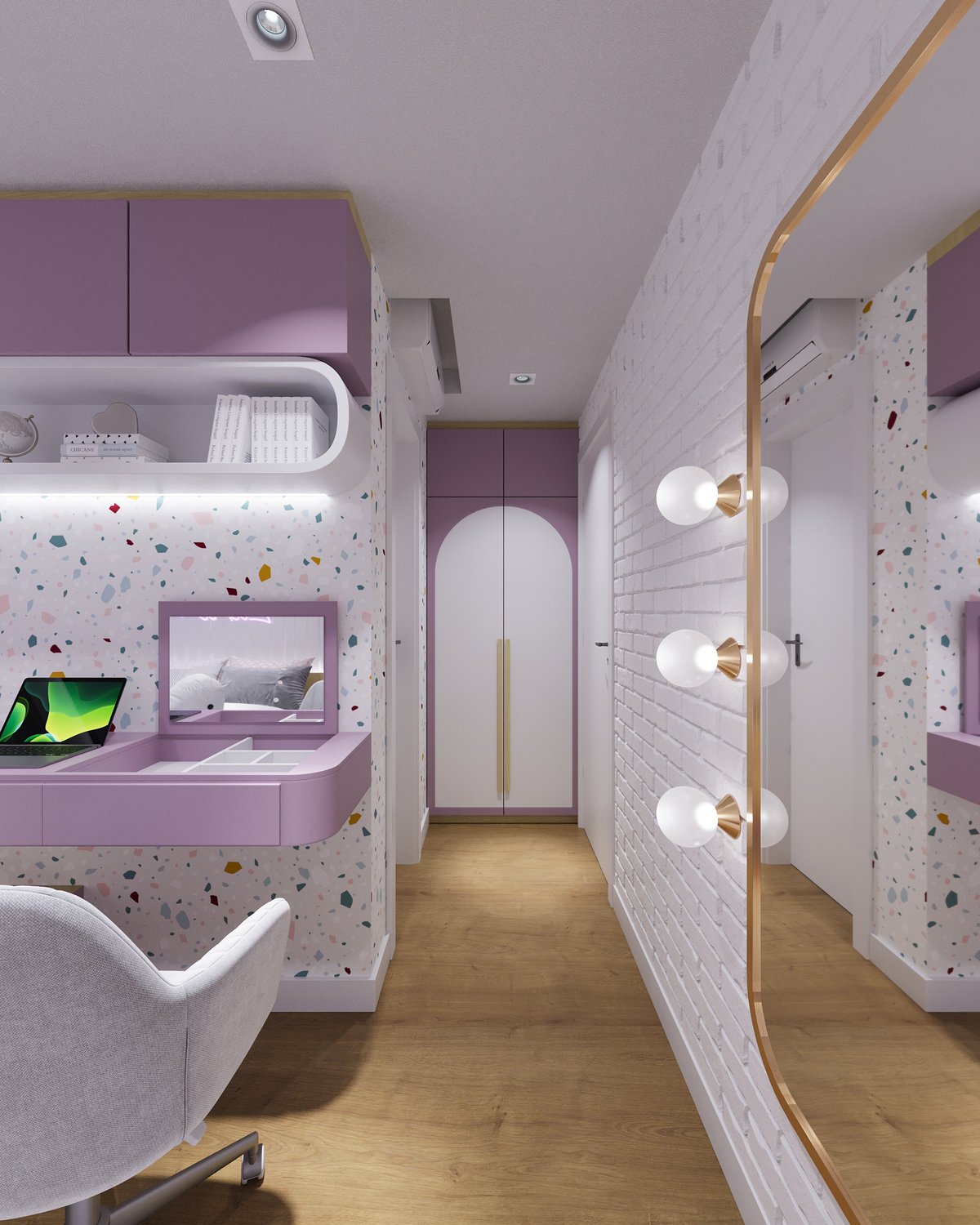 Escolhemos móveis com detalhes de madeira, nichos, iluminação estratégica, texturas, um layout que trouxe uma amplitude gigantesca e a cor roxa, que é a preferida dela.